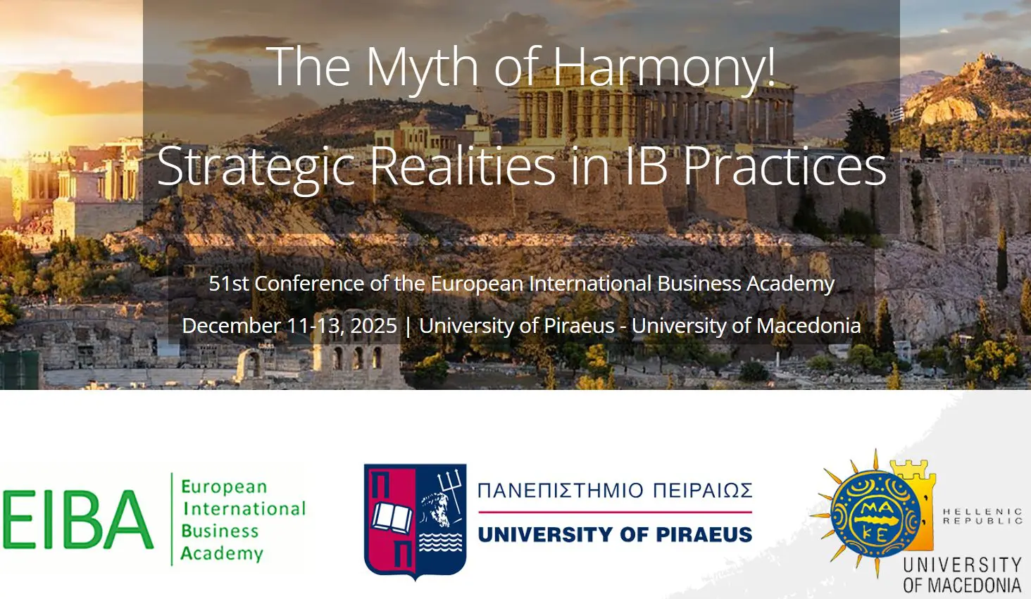 Με χαρά σας ενημερώνουμε ότι το 51ο Ετήσιο Διεθνές Συνέδριο της European International Business Academy (EIBA) με θέμα “The Myth of Harmony – Strategic Realities in International Business Practices” θα πραγματοποιηθεί στην Αθήνα, 11–13 Δεκεμβρίου 2025, στο Μέγαρο Μουσικής Αθηνών.